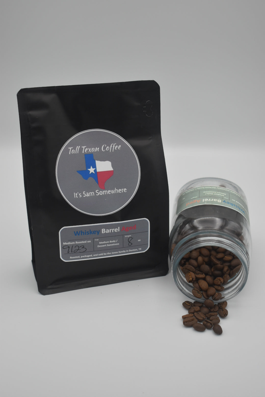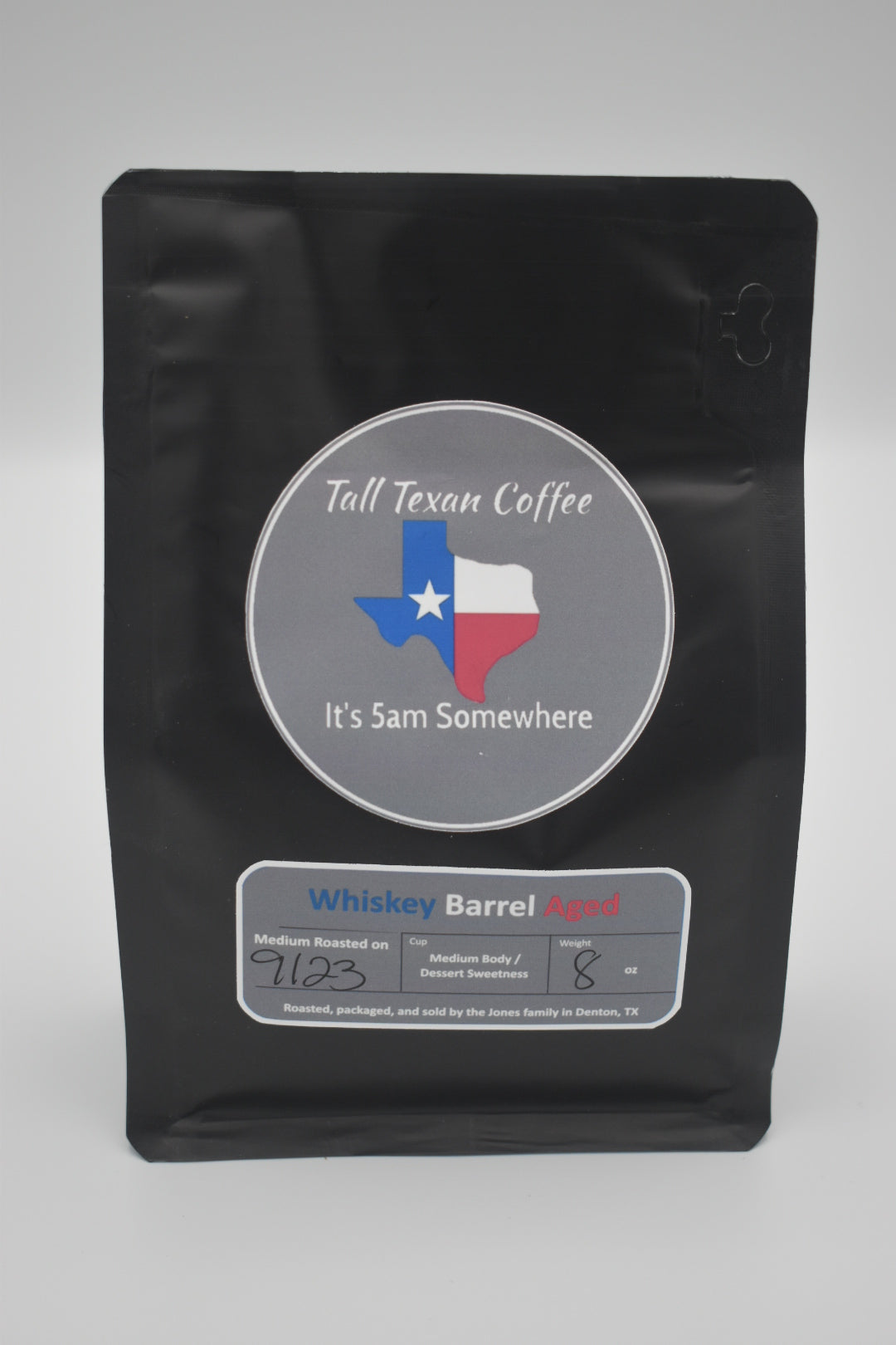 Our current barrel aged offering has been aged 14 days in a freshly emptied cask strength (126 proof) whiskey barrel (American Oak #1 heavy char) from a local distillery. This coffee is roasted to Full City + and has strong notes of oak, vanilla, and chocolate.